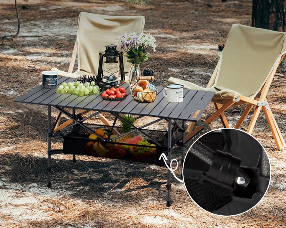 - Stabilny blat – idealny pod sprzęt turystyczny, kuchenkę czy posiłki